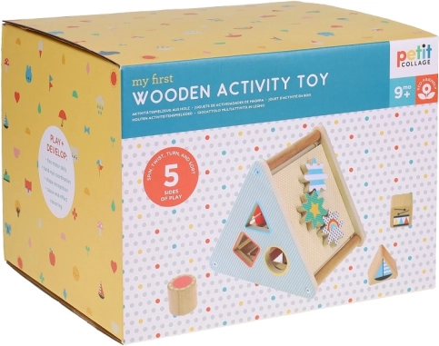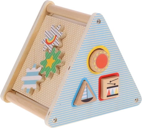 Das Spielzeug enthält verschiedene ausgeschnittene Öffnungen für das Einfügen von Formen und Zahnräder zur Förderung der Feinmotorik.