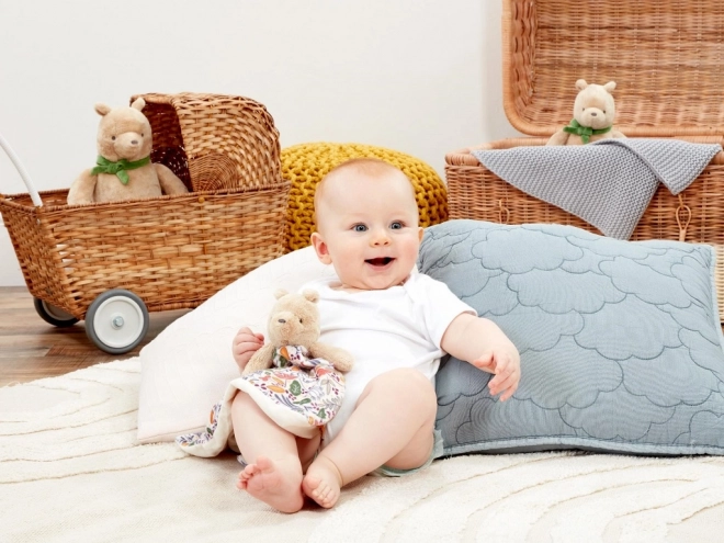 Das Winnie-Puuh-Schmusetuch ist ein weicher Begleiter für Neugeborene und Babys, der beruhigt, Geborgenheit vermittelt und jedes Einschlafritual angenehmer macht. Extraweicher Plüsch und ein zart gemusterter Stoff laden zum Fühlen ein und fördern die Sinne. Durch die kompakten Maße ideal fürs Bettchen, den Kinderwagen und unterwegs.