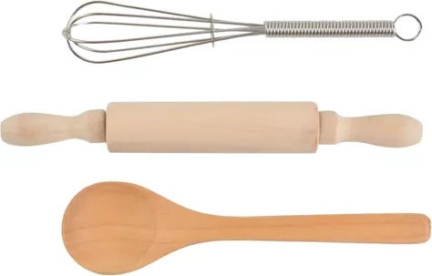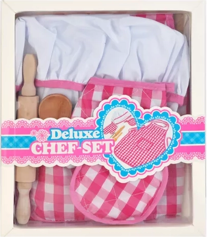 - Komplettes Set: Besteht aus Schürze, Kochmütze, Schutzhandschuh, Untersetzer, Holz-Rolle, Holzlöffel und Metall-Schneebesen.