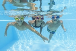 Robuste Polycarbonatgläser mit UV-Filter schützen die Augen vor Sonne und chlorhaltigem Wasser.