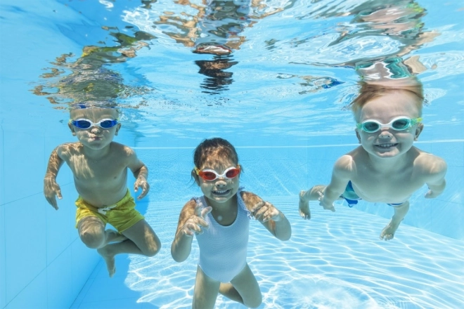 Stylische und bequeme Kinder-Schwimmbrille der Marke Bestway, ideal für die ersten Schwimmstunden dank weicher, haftender Konstruktion und sicheren UV-Filtern.