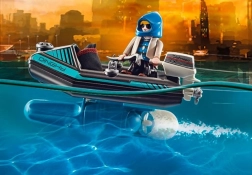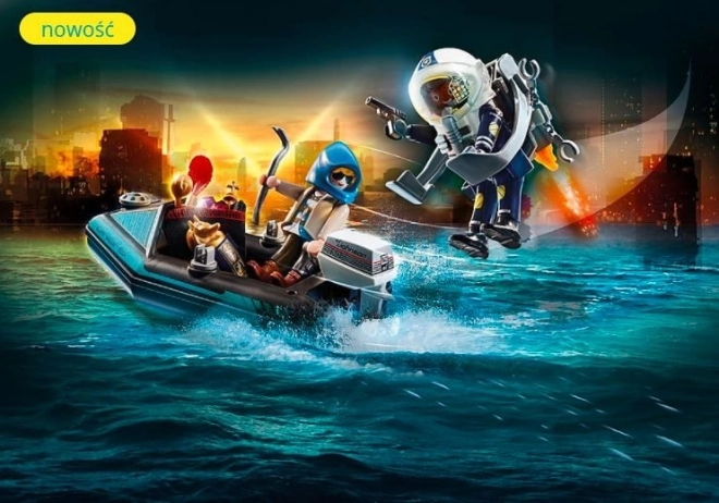 Alles ist bereit für die Aktion in Playmobil City Action. Der Polizist mit dem Jetpack nähert sich schnell dem Dieb, der mit gestohlener Kunst auf dem Boot flieht. Dank seiner Klugheit und Ausrüstung kann der Offizier den Verbrecher schnell überwältigen und die wertvollen Gegenstände ins Museum zurückbringen.