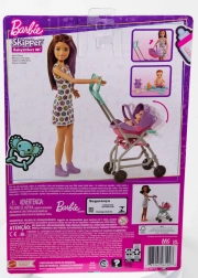 Entdecke den Zauber von Pflege-Rollenspielen mit dem BARBIE Skipper Babysitter Set. Kinder können das Baby im Kinderwagen spazieren fahren, der beim Schieben schaukelt, und es dank des abnehmbaren Tragekorbs leicht transportieren. Die stylische Puppe trägt ein Sommerkleid und Schuhe; das Baby und farbenfrohes Zubehör laden zu unendlichen Geschichten ein.