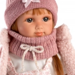 Die Puppe trägt ein Blumenkleid, ergänzt durch einen gestrickten Hut und warme Socken, was einen lebendigen und fröhlichen Look kreiert.