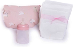 Im Set enthalten sind eine nachfüllbare Flasche und zwei Einwegwindeln – alles, was Kinder zum Füttern und Wickeln brauchen.