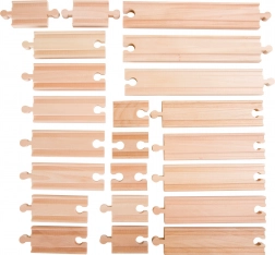 Die hochwertige Verarbeitung der Holzschienen sorgt für sicheres Spielen und einfaches Zusammenstellen verschiedener Eisenbahnstrecken.