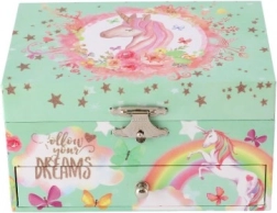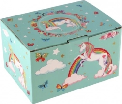 Diese zauberhafte Spieluhr-Schmuckschatulle mit Einhorn in Pastellgrün begeistert kleine Schmückerinnen. Nach dem Aufziehen des Schlüssels dreht sich im Inneren die Einhornfigur und eine zarte Melodie erklingt. Innen befinden sich ein Spiegel, übersichtliche Fächer und eine praktische Schublade für kleine Schätze. Die robuste Karton-Konstruktion, Metallelemente und die bezaubernden Illustrationen von Regenbogen, Sternchen und Schmetterlingen runden jedes Kinderzimmer wunderbar ab.