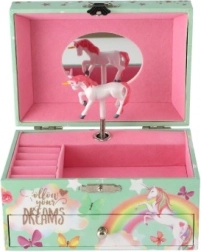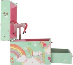 Diese stilvolle Spieluhr-Schmuckschatulle mit Einhorn ist ideal zur Aufbewahrung von Ringen, Ohrringen und kleinen Geheimnissen. Beim Öffnen des Deckels mit Spiegel beginnt sich nach dem Aufziehen des Schlüssels das weiß-rosa Einhorn zu drehen und sanfte Musik erklingt. Das Innere bietet strukturierte Fächer für Schmuck, während die untere Schublade weiteren Kostbarkeiten Platz bietet.
