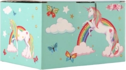 Stabiler Karton mit Metallverschluss und -scharnieren sorgt für lange Lebensdauer. Pastellgrüne Motive von Regenbogen, Sternchen und Schmetterlingen schmücken jedes Kinderzimmer wunderschön.