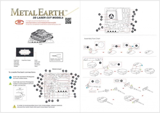 Entnehmen Sie die einzelnen Teile aus den Metallplatten; bei Bedarf verwenden Sie kleine Seitenschneider (nicht enthalten). Die Teile werden mittels Laschen und entsprechenden Öffnungen miteinander verbunden. Biegen Sie die Laschen mit einer kleinen Flachzange (nicht enthalten) um und verbinden Sie nach und nach alle Verriegelungen, bis ein sehr realistisches Meisterstück entsteht!