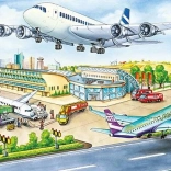 Die Illustration eines geschäftigen Flughafens mit startenden und landenden Flugzeugen regt die Fantasie an und hilft Kindern, die Welt der Luftfahrt zu entdecken.