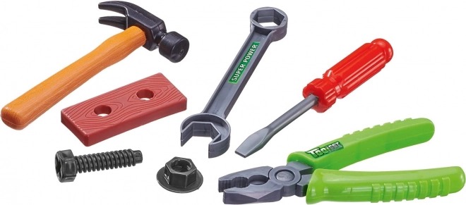 Im Lieferumfang enthalten ist ein Set aus sicherem Kunststoffwerkzeug (Hammer, Schlüssel, Zange, Schraubendreher und Zubehör), das die Feinmotorik fördert und kreatives Spielen anregt.
