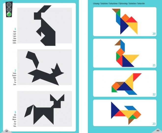 Dieser Kinder-Tangram in der Metalldose bietet einen spielerischen Weg von ersten einfachen Formen bis zu ausgearbeiteten Silhouetten von Tieren und Figuren. Dank drei Schwierigkeitsstufen bauen Kinder nach und nach Sicherheit und Freude am Erfolg auf. Ist eine Aufgabe zu anspruchsvoll, können die Teile direkt nach der beiliegenden Lösung gelegt werden.