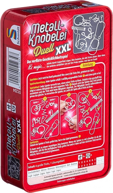 SCHMIDT präsentiert das beeindruckende Metallpuzzle-Set Duell XXL, entwickelt für Liebhaber logischer Rätsel und strategischen Denkens. Jedes der sechs Puzzles besteht aus zwei Teilen, und Ihre Aufgabe ist es, einen Weg zu finden, sie ohne Kraftanwendung voneinander zu trennen und anschließend wieder in die ursprüngliche Form zusammenzusetzen. Die Puzzles kommen in einer stilvollen Blechdose, die eine sichere Aufbewahrung und einfachen Transport gewährleistet.