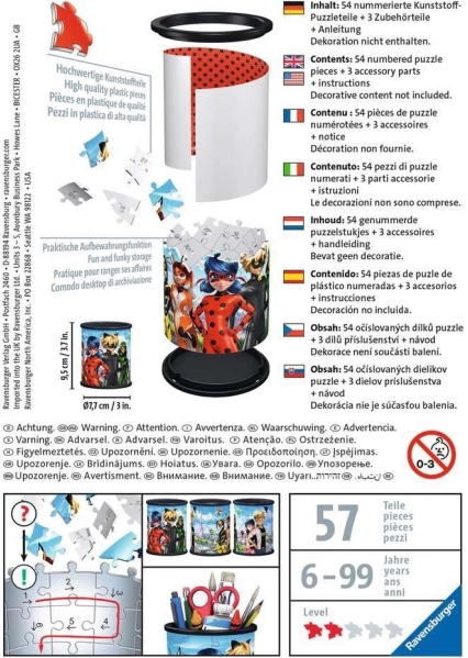 Entdecken Sie den Zauber des 3D Puzzles von Ravensburger, das dank spezieller gebogener Teile leicht zusammenzusetzen ist. Diese garantieren eine stabile Konstruktion ohne Klebstoff. Nach dem Zusammenbau dient der Ständer nicht nur als Platz für Stifte, sondern auch als Aufbewahrungsort für Kosmetik oder andere Kleinigkeiten im Kinderzimmer.
